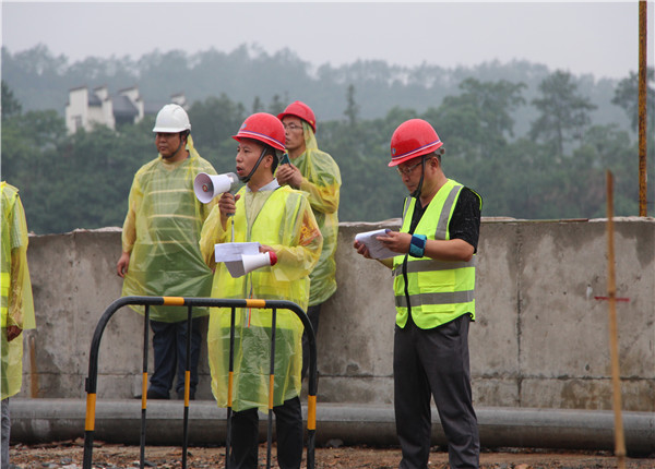本次演練模擬因下特大暴雨,項目部人員在施工現(xiàn)場巡查,查看水文站處水情時,因洪水來勢兇猛,造成兩名員工被困在水文站內的突發(fā)情況展開救助救援。