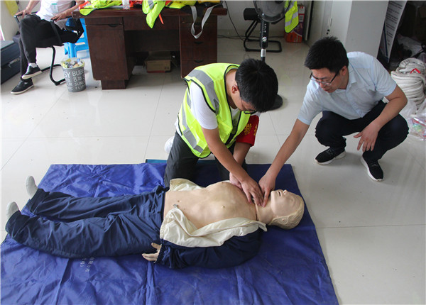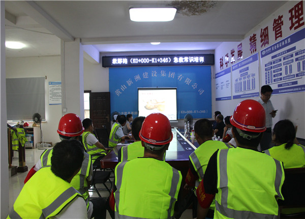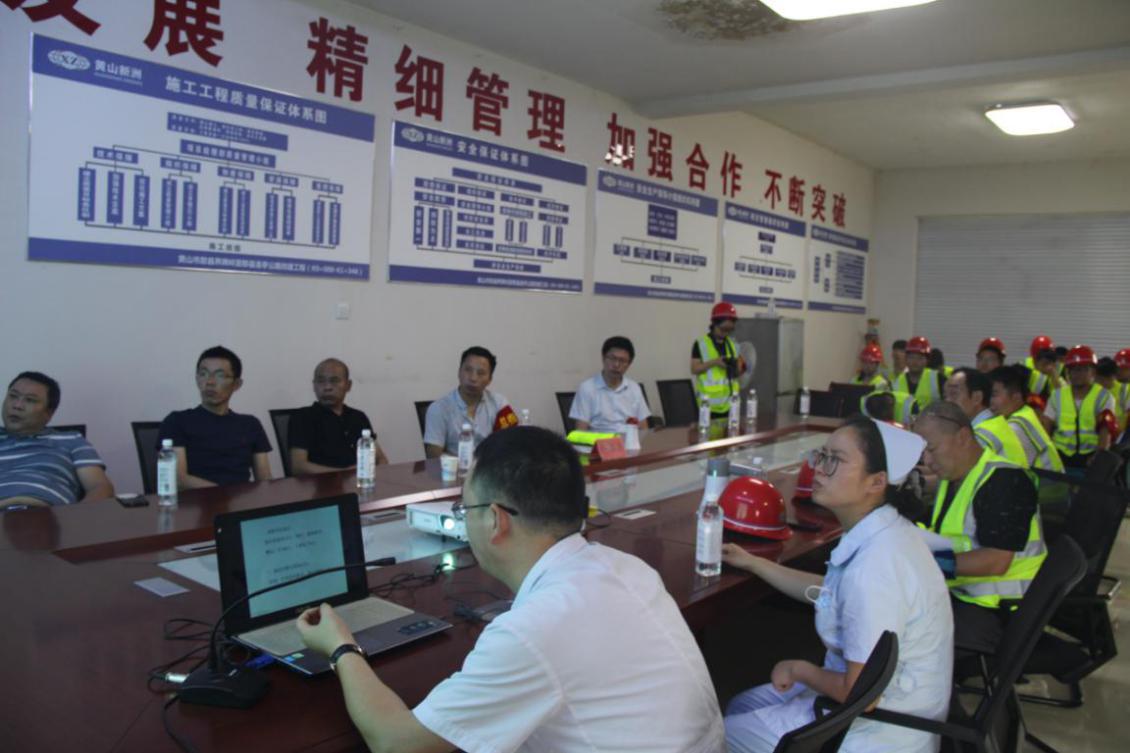 為確保演練順利進行,項目經(jīng)理巴亮(現(xiàn)場指揮)組織多次預演,并邀請歙縣人民醫(yī)院專家于歙黟路項目部會議室進行現(xiàn)場急救常識培訓(止血方法、包扎、固定、搬運等創(chuàng)傷技術、心肺復蘇急救方法等)。