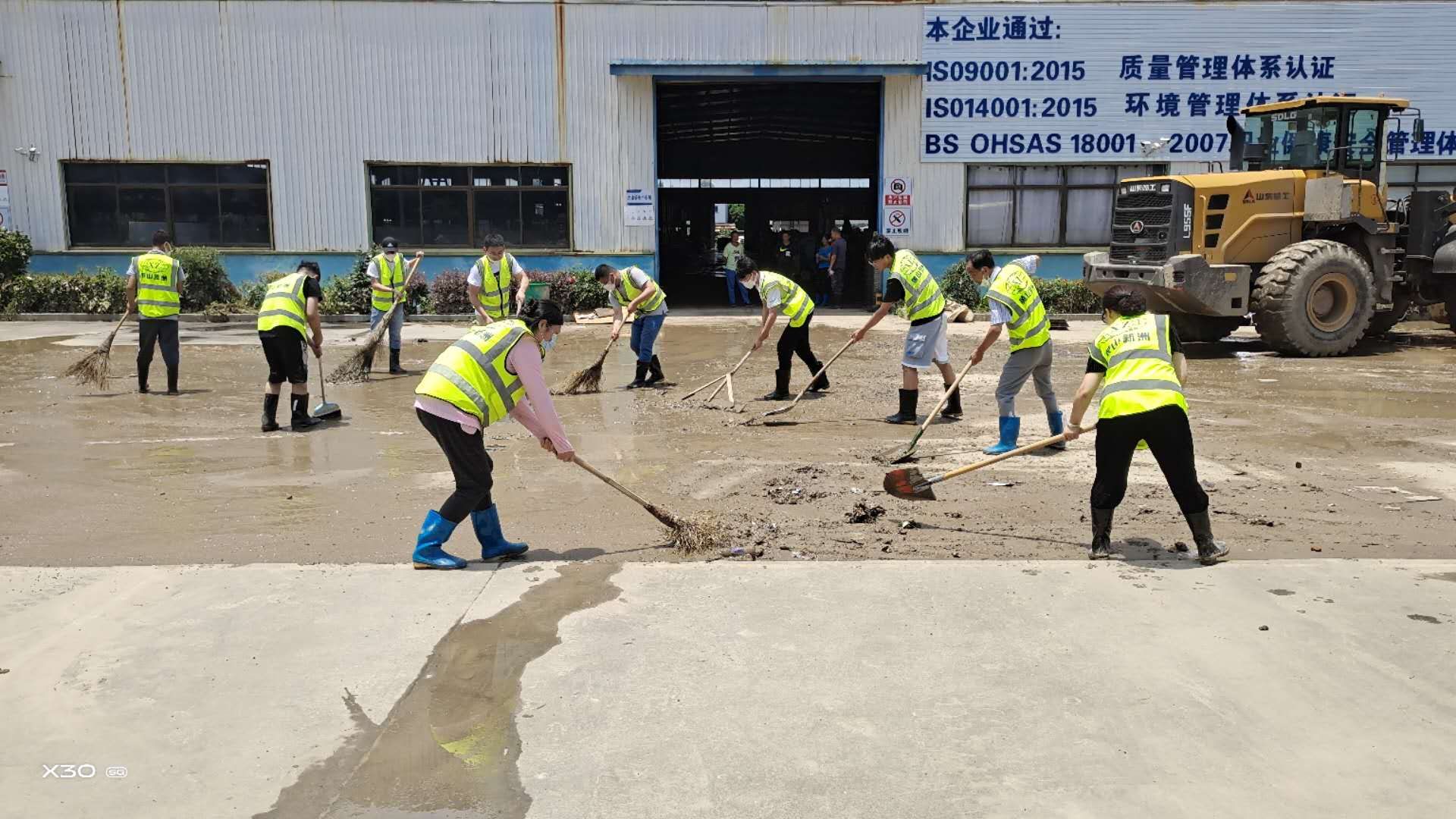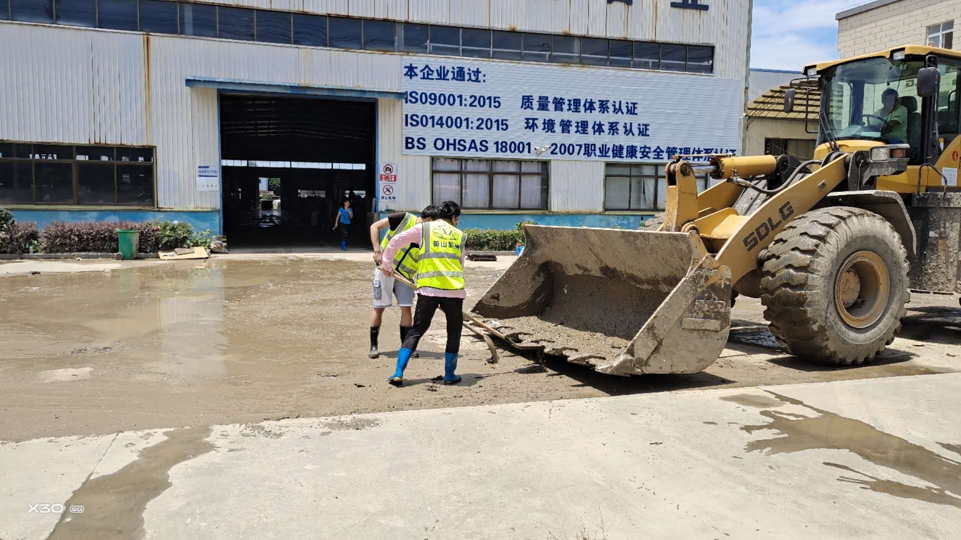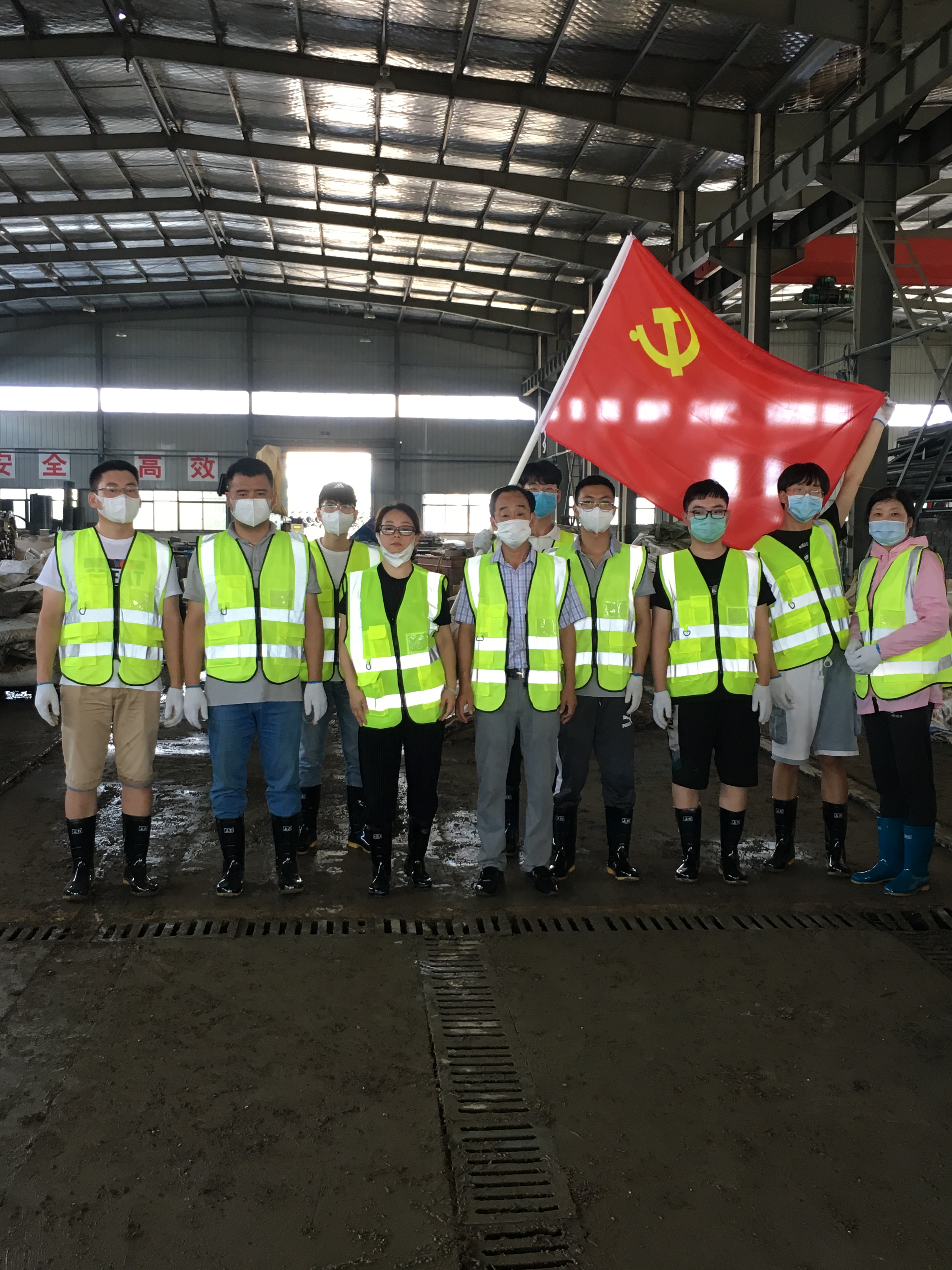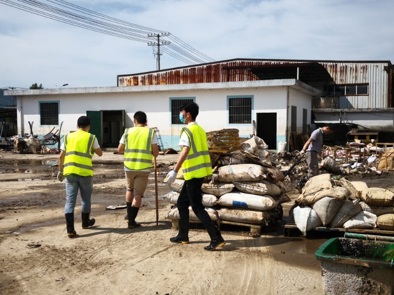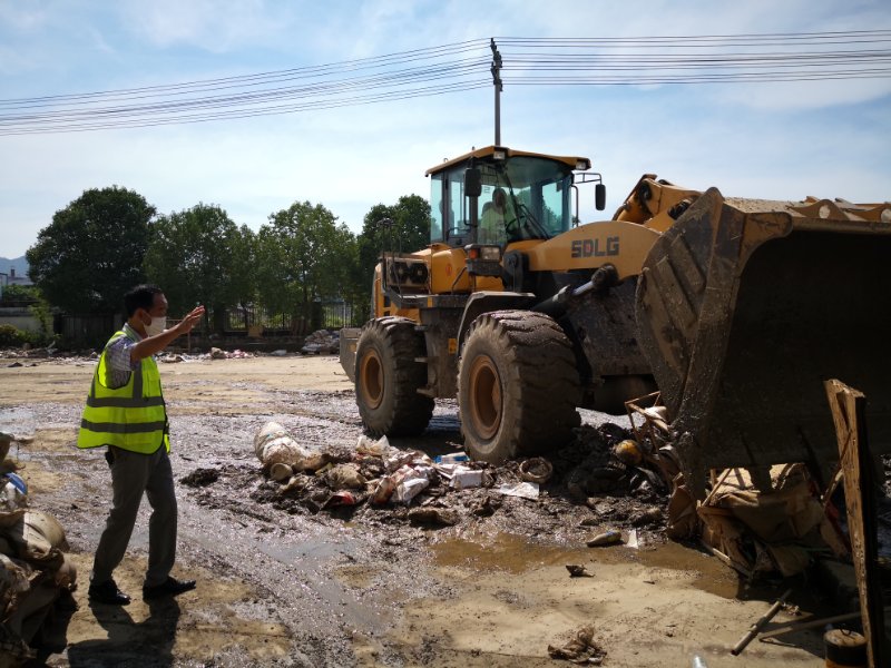 上午8時許,黃山新洲公司黨員、入黨積極分子、抗洪搶險志愿者開著鏟車、灑水車從屯溪區(qū)出發(fā)到達歙縣經開區(qū)受澇嚴重的黃山順濤管業(yè)有限公司進行衛(wèi)生清掃,先清理垃圾及淤泥,再進行集中消毒消殺。烈日炎炎,新洲支部的黨員志愿者們個個不怕臟,不怕累,頂著烈日,揮汗如雨。通過一個上午的勞動,在人機配合下,掃除了垃圾,清除了表面泥土,受災企業(yè)的工作環(huán)境煥然一新。