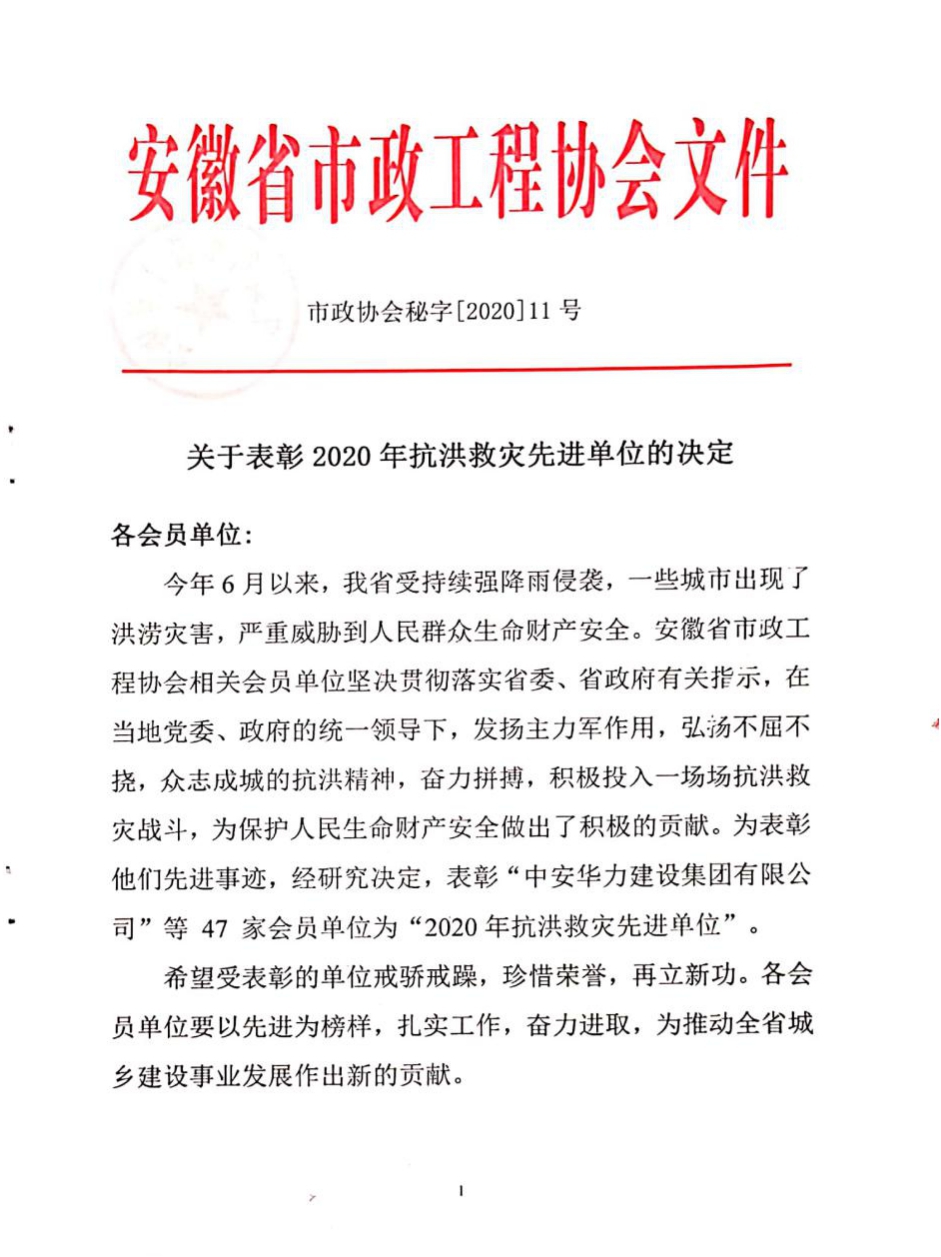 2020年8月17日,黃山新洲建設集團有限公司榮獲“2020年抗洪救災先進(jìn)單位”稱(chēng)號。