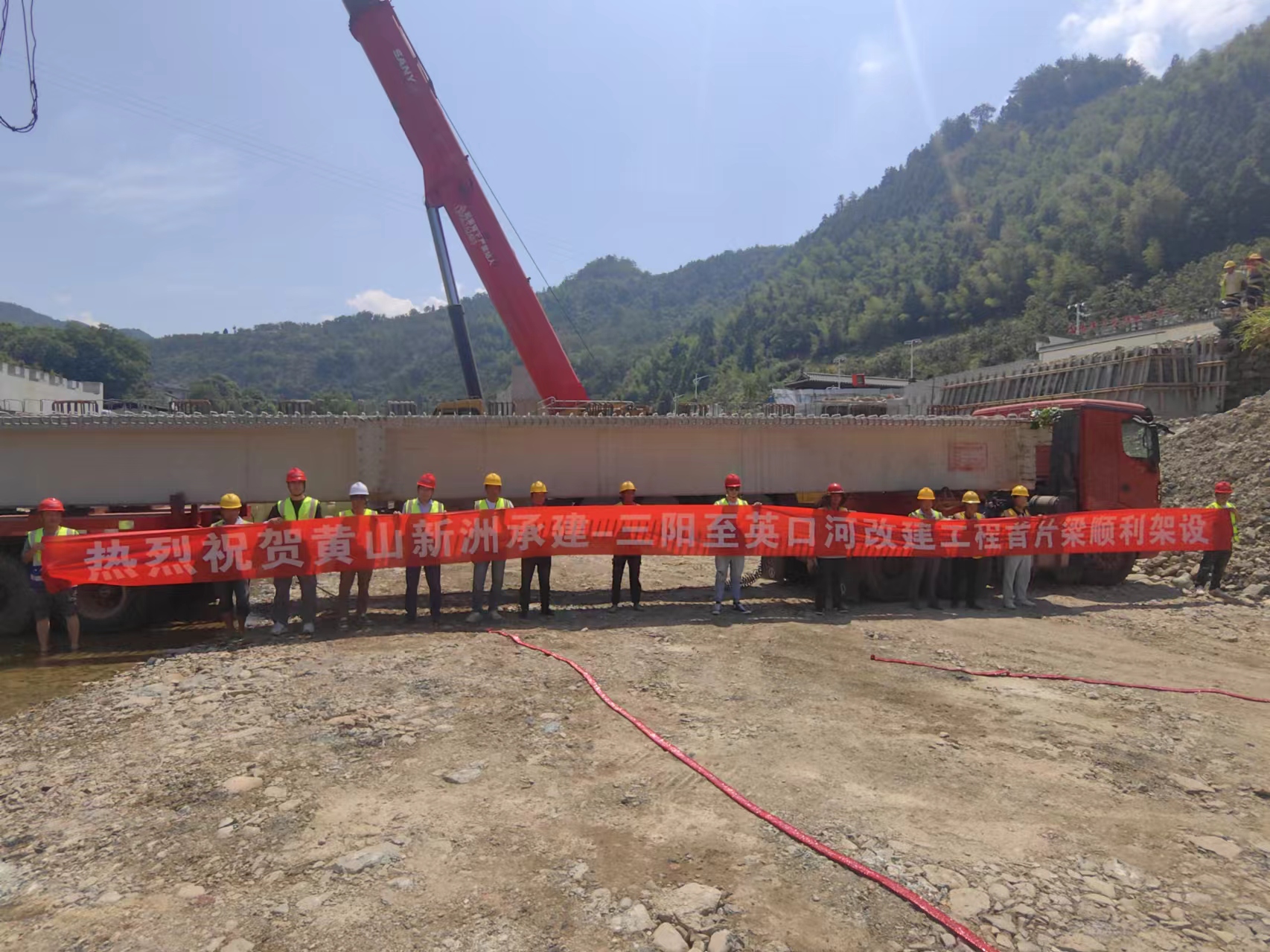 連日的持續高溫擋不住筑路人的步伐,8月5日上午,炎炎烈日之下,隨著(zhù)煙花爆竹的一聲聲爆炸,我公司承建的歙縣三陽(yáng)-英坑河口農村道路改建工程,K1+148線(xiàn)外橋第一片梁板架設成功。